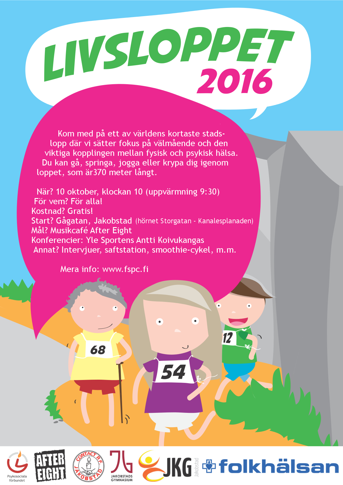 Arrangörer: Initiativtagare är Psykosociala förbundet som arrangerar loppet i samarbete med Folkhälsan Rehabilitering Östanlid, Jakobstads gymnasium, JKG, Contact rf och After Eight.